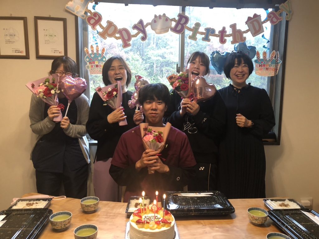 3月生まれのスタっフさん お誕生日おめでとうございます。お昼休みに、ランチ会を開きました。3月生まれは、男子一人 若いスタッフさんでお話も恋バナもありました!いただいたお花をお母さんに渡しますと言うスタっフさんも見えました