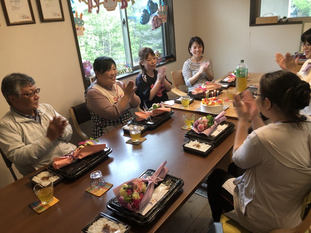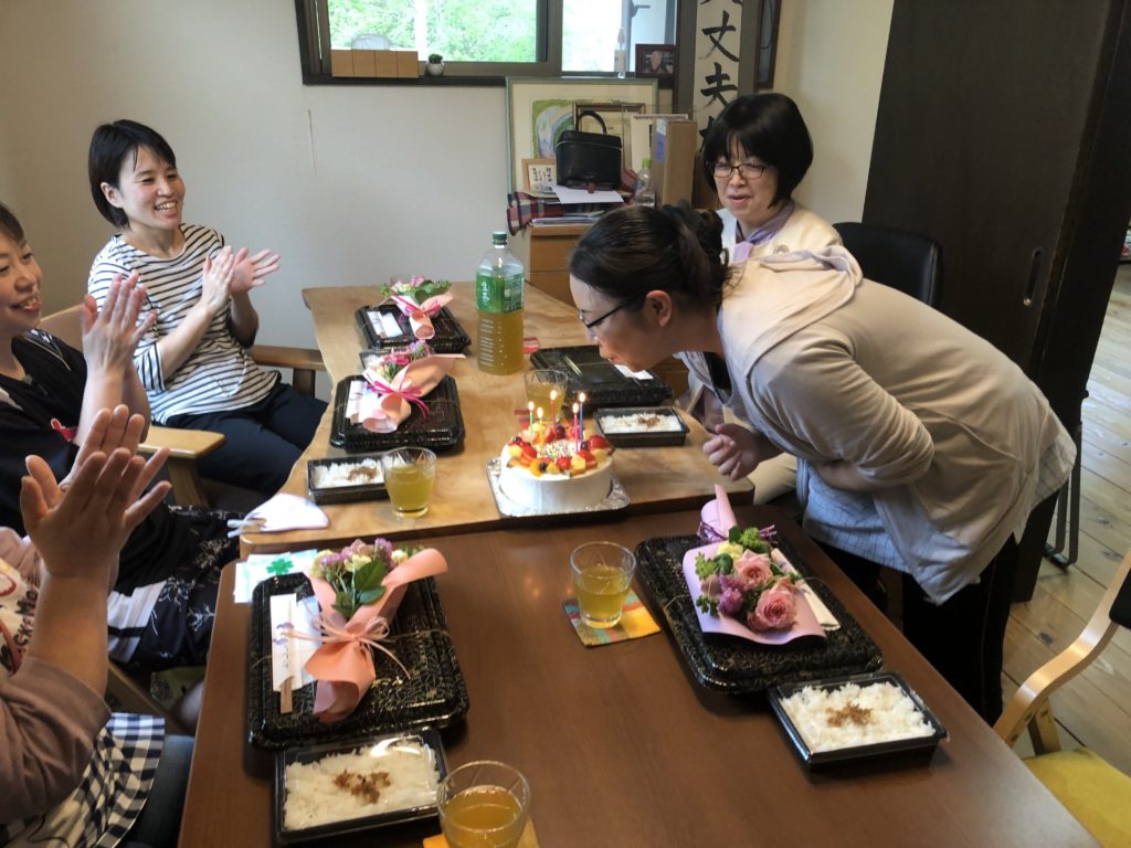 4月生まれのスタッフさんの誕生日おめでとうございます。お弁当を食べながらの自分の趣味話や今、はまっている事など、楽しいおしゃべりで盛り上がりました。